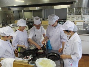今回のメニューは双粘魷魚條、糖醋五花肉、蠣油素菜、福建薄餅でした。特別に黒クコの入った杏仁豆腐もいただきました。学生からは「丁寧に教えてもらえてよかった。」「意外と簡単にできた。」との感想が聞かれました。ありがとうございました。