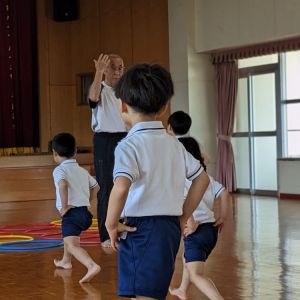先生の動きに合わせて、すり足や手の動きの練習をしました。